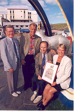 Foto 4: Fritz Fadranski (3. von links) am 30.7.1998 vor dem Rathaus von Hammerfest mit Arnulf Olsen (links), zweifacher ehemaliger Bürgermeister von Hammerfest, Kåre Rønbeck (2. von links), ehemaliger Bürgermeister von Hammerfest, Bente Andreassen (rechts), Vizebürgermeisterin von Hammerfest (Foto: Sammlung Fritz Fadranski, Düren)